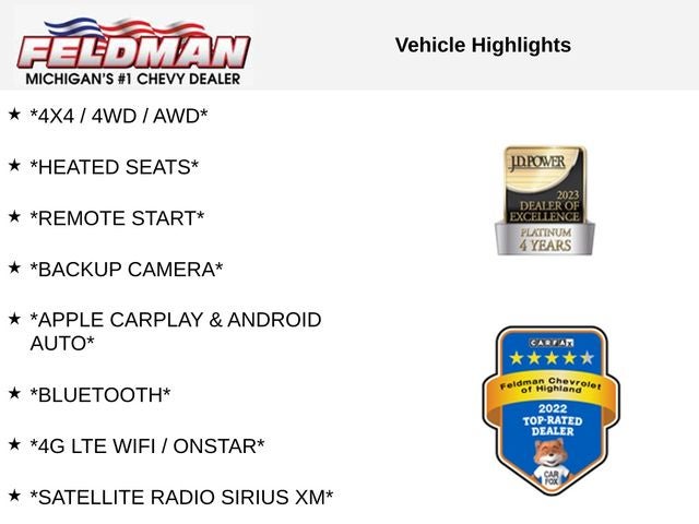 *4X4 / 4WD / AWD*, *HEATED SEATS*, *REMOTE START*, *BACKUP CAMERA*, *APPLE CARPLAY & ANDROID AUTO*, *Bluetooth®*, *4G LTE WIFI / ONSTAR*, *SATELLITE RADIO SIRIUS XM*, *LOCAL TRADE*, KEYLESS ENTRY, STEERING WHEEL CONTROLS, CRUISE CONTROL, *VEHICLE LOCATED AT FELDMAN CHEVROLET OF HIGHLAND CALL (248) 889-3232*, *GENERAL MOTORS AWARD TOP CUSTOMER SERVICE DEALERSHIP IN METRO DETROIT*, 4WD.