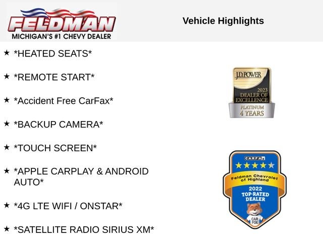 *HEATED SEATS*, *REMOTE START*, *Accident Free CarFax*, *BACKUP CAMERA*, *TOUCH SCREEN*, *APPLE CARPLAY & ANDROID AUTO*, *4G LTE WIFI / ONSTAR*, *SATELLITE RADIO SIRIUS XM*, *LOW MILES*, *VEHICLE LOCATED AT FELDMAN CHEVROLET OF HIGHLAND CALL (248) 889-3232*, *GENERAL MOTORS AWARD TOP CUSTOMER SERVICE DEALERSHIP IN METRO DETROIT*, Jet Black Cloth.