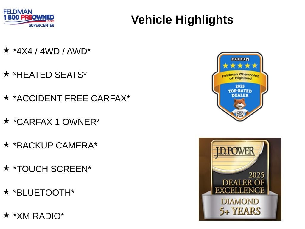 *4X4 / 4WD / AWD*, *HEATED SEATS*, *ACCIDENT FREE CARFAX*, *CARFAX 1 OWNER*, *BACKUP CAMERA*, *TOUCH SCREEN*, *Bluetooth®*, *XM RADIO*, *LOW MILES*, KEYLESS ENTRY, STEERING WHEEL CONTROLS, SAFARI WINDOWS, ABS brakes, Alloy wheels, Compass, Electronic Stability Control, Heated door mirrors, Heated Front Bucket Seats, Heated front seats, Illuminated entry, Leather Seat Trim, Low tire pressure warning, Navigation System, Remote keyless entry, Traction control.